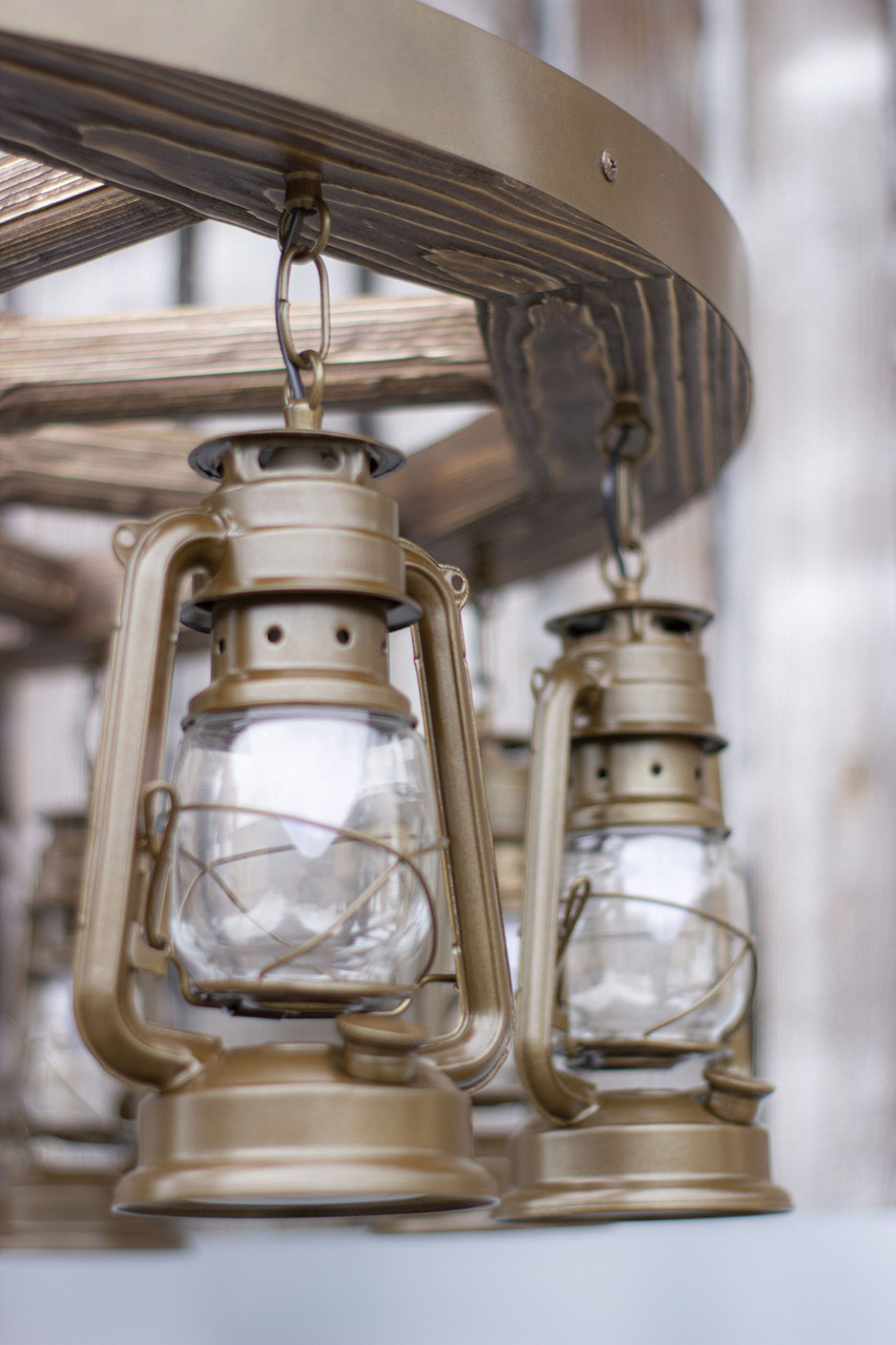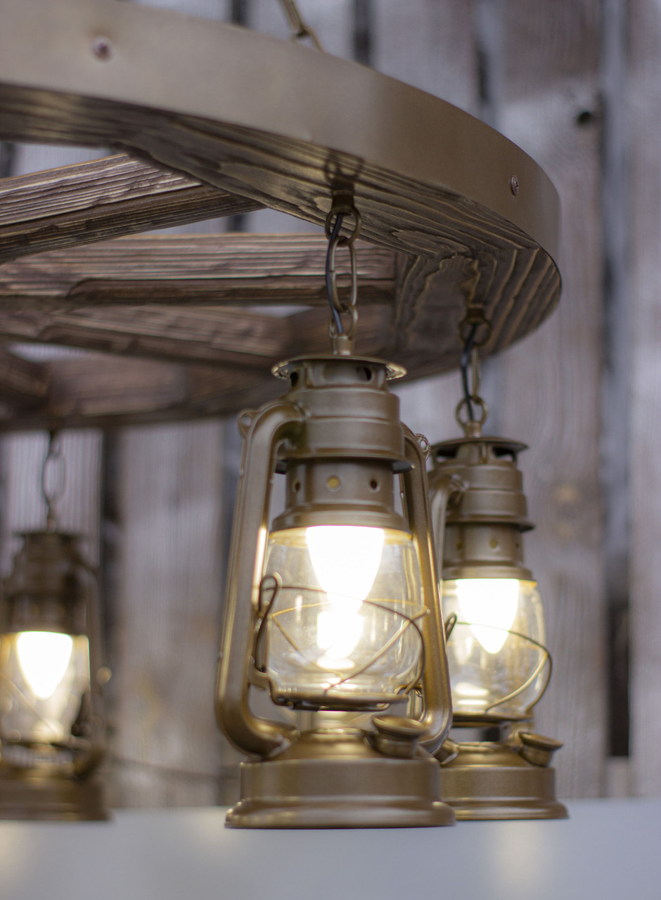 Декоративной изюминкой люстр в стиле кантри в интерьере является то, что они прекрасно будут смотреться как в частных домах таки и в гостиницах и отелях, в ресторанах и кафе. Данные светильники создадут тёплую, простую обстановку, внеся в интерьер своеобразность и уют, деловую строгость и презентабельность, ощущение дороговизны и антикварной ценности. Люстра колесо «керосиновая лампа» на десять спиц и десять ламп. Обрабатывается на профессиональных станках, покрывается мебельным лаком и подвергается искусственному старению. Эксклюзивные светильники под старину в виде колеса от телеги — это не только уникальный дизайн и изысканность стиля, это еще и творческая, эксклюзивная работа мастера, который вкладывает в каждое изделие частичку души.